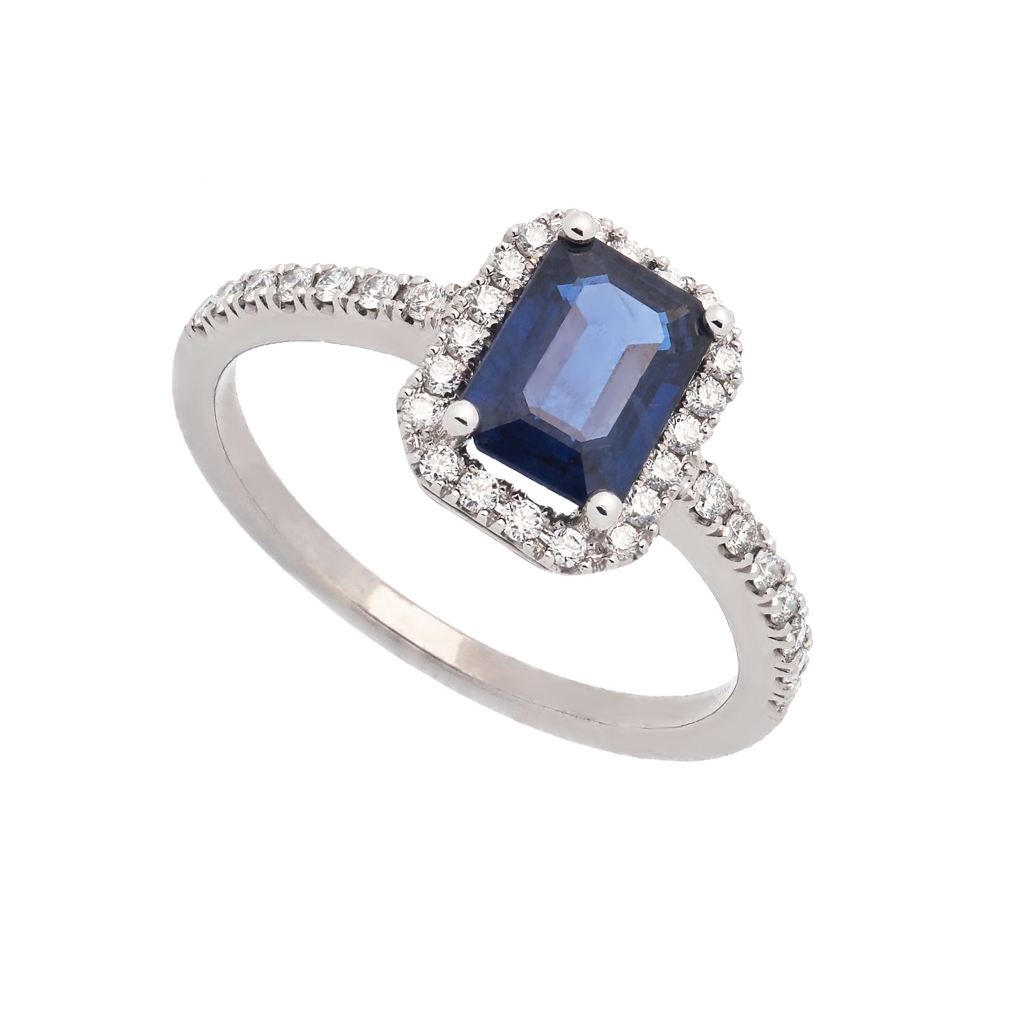 Anillo de oro blanco de 18 quilates con zafiro natural talla esmeralda de peso 1.08 cts. y diamantes talla redonda de peso total 0.24 cts.