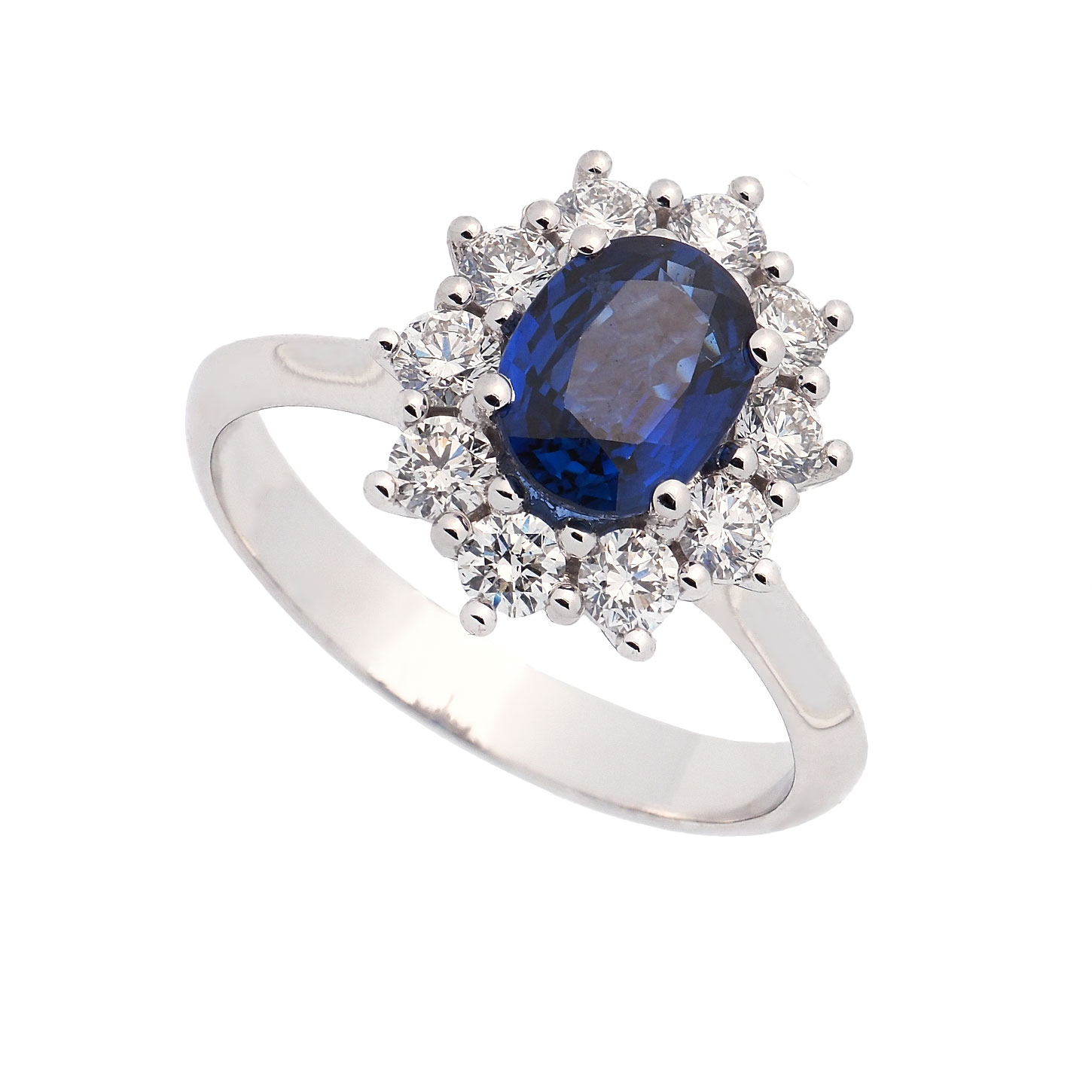 Anillo de oro blanco de 18 quilates con zafiro natural talla oval de peso 1.11 cts. y brillantes talla redonda con peso total 0.53 cts.