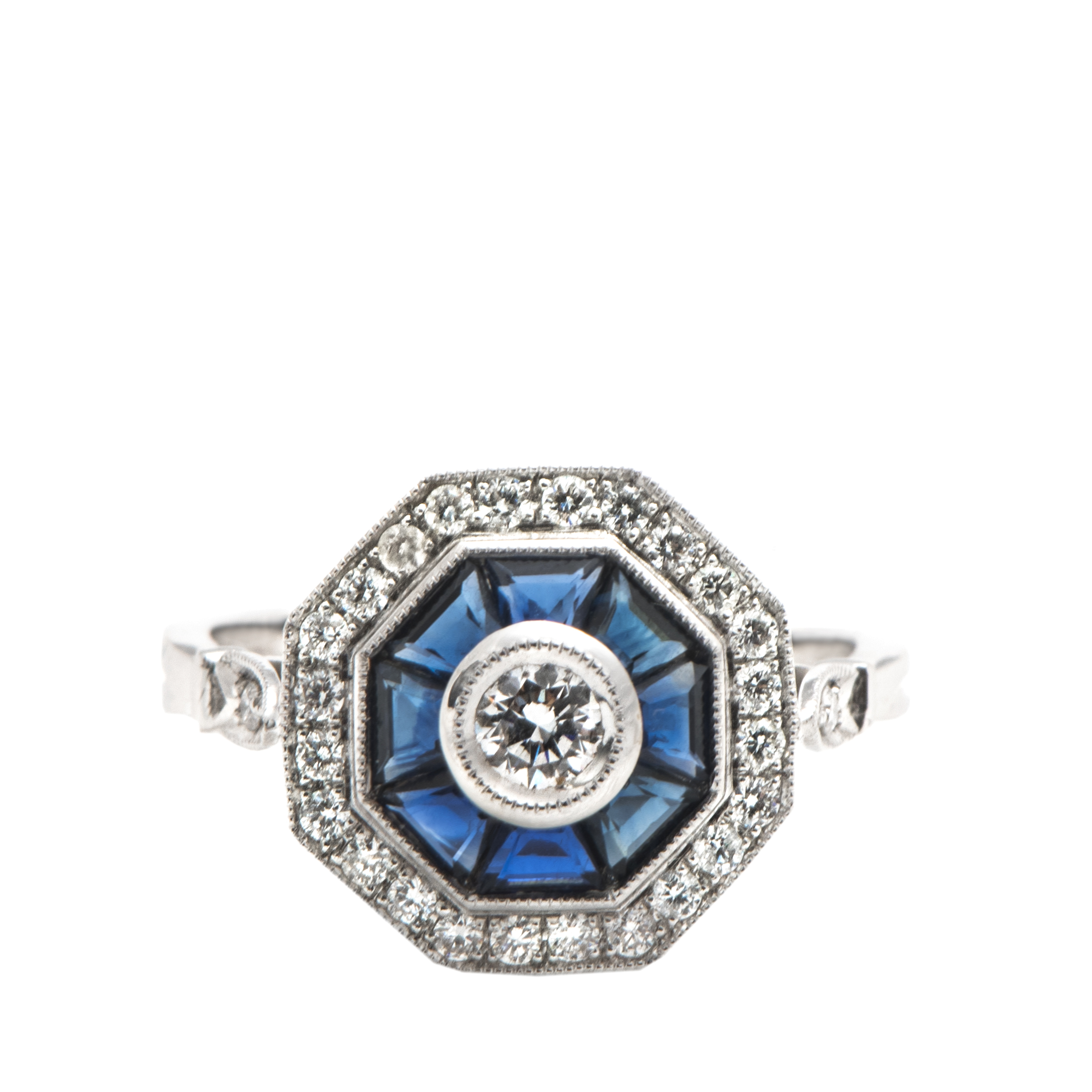 Anillo de oro blanco de 18 quilates con 1,06 cts. de zafiros y brillante central de peso 0,27 cts.
